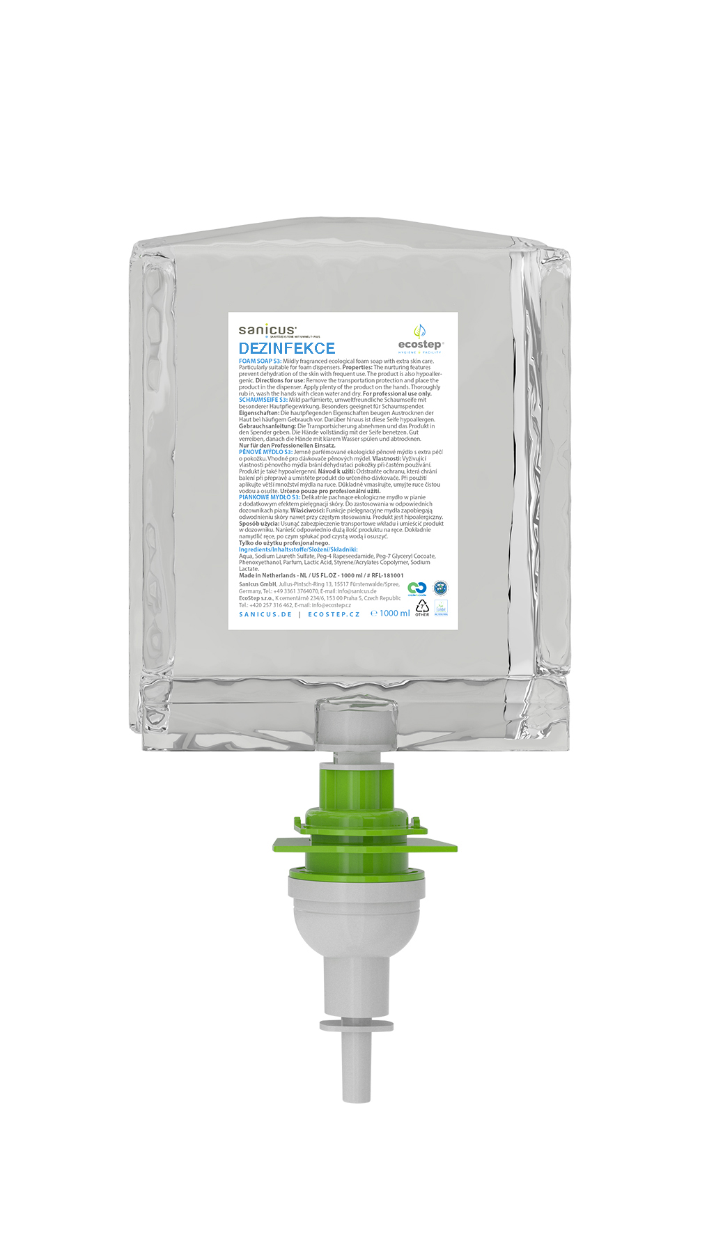Novinka na trhu - malý a výkonný penový dávkovač dezinfekcie ECOSTEP-S3 zaručuje vždy presné dávkovanie nezávisle na stave nabitia batérií. Každý nový sáčok má vlastný speňovač, čo vždy zaručí špičkový chod dávkovača. Špeciálne vákuové sáčky s dezinfekciou pre zjemnenie zabraňujú vysušeniu a zaručujú čistú prevádzku bez vytekania na umývadlo alebo podlahu.